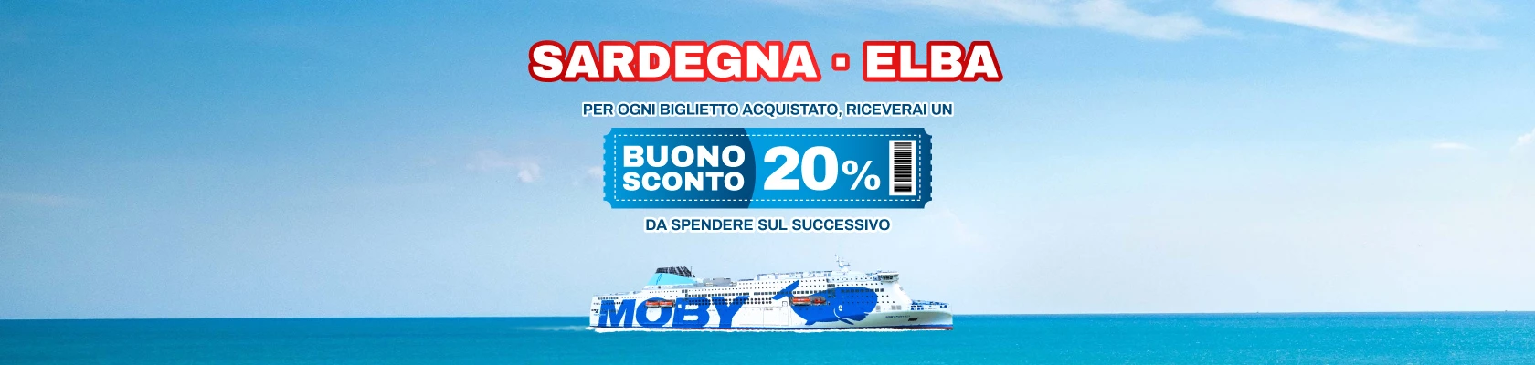 • Tutti i clienti che acquistano un biglietto MOBY Sardegna/Elba dal 01.11.2025 al 30.11.2025 per partenze fino al 31.12.2025 (per i biglietti di andata e ritorno, entrambe le tratte dovranno essere per partenze fino al 31.12.2025),  riceveranno un buono in euro, pari al 20% dell'importo pagato, al netto di tasse, ETS, diritti, assicurazione, pasti e competenze;